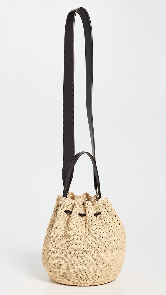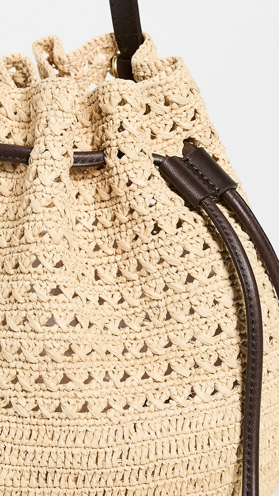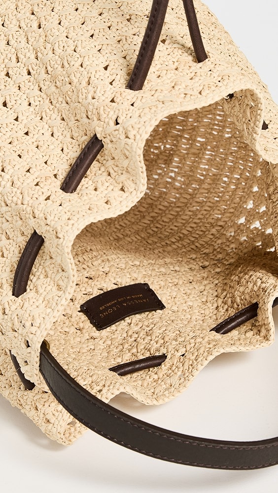 Raffia Old-tone hardware Leather trim and top handle Slouchy silhouette Drawstring top Optional strap Lining: Unlined Weight: 17oz / 0.48kg Made in the USA Style #JANES30292