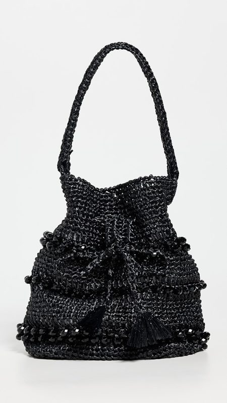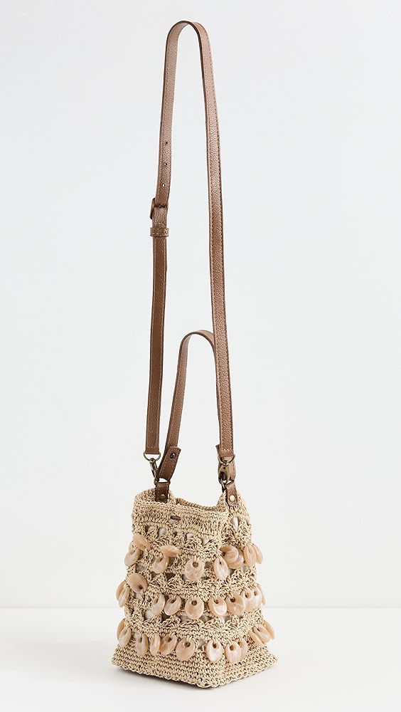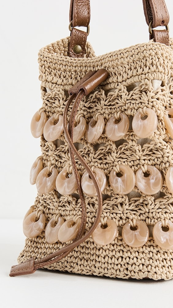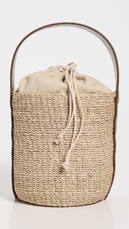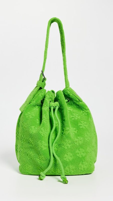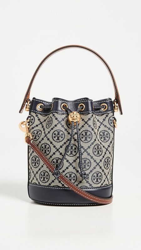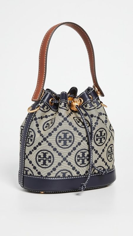Fabric: Jacquard Monogram pattern Leather trim Gold-toned hardware Drawstring closure Optional, adjustable shoulder strap Textile lining Weight: 11oz / 0.31kg Imported, China Style #TORYB49310 A scaled-down Tory Burch bucket bag, detailed with a rendition of the label's monogram for a polished and eye-catching look. Two shades of leather trim lend…