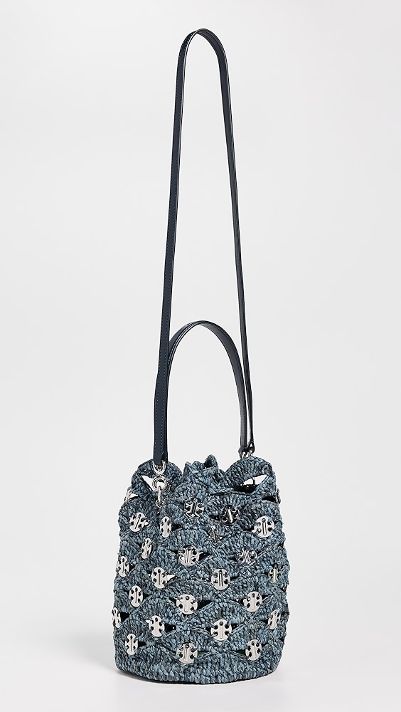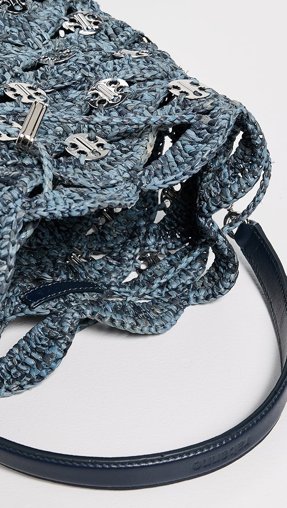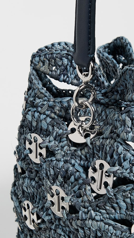 Fabric: Jacquard Structured silhouette Gold-tone hardware Monogram print Drawstring closure Patch interior pocket Optional, adjustable strap Suede lining Weight: 23oz / 0.65kg Imported, Vietnam Style #TORYB49238 A scaled-down Tory Burch bucket bag, detailed with a rendition of the label's monogram for a polished and eye-catching look. Two shades of leather…