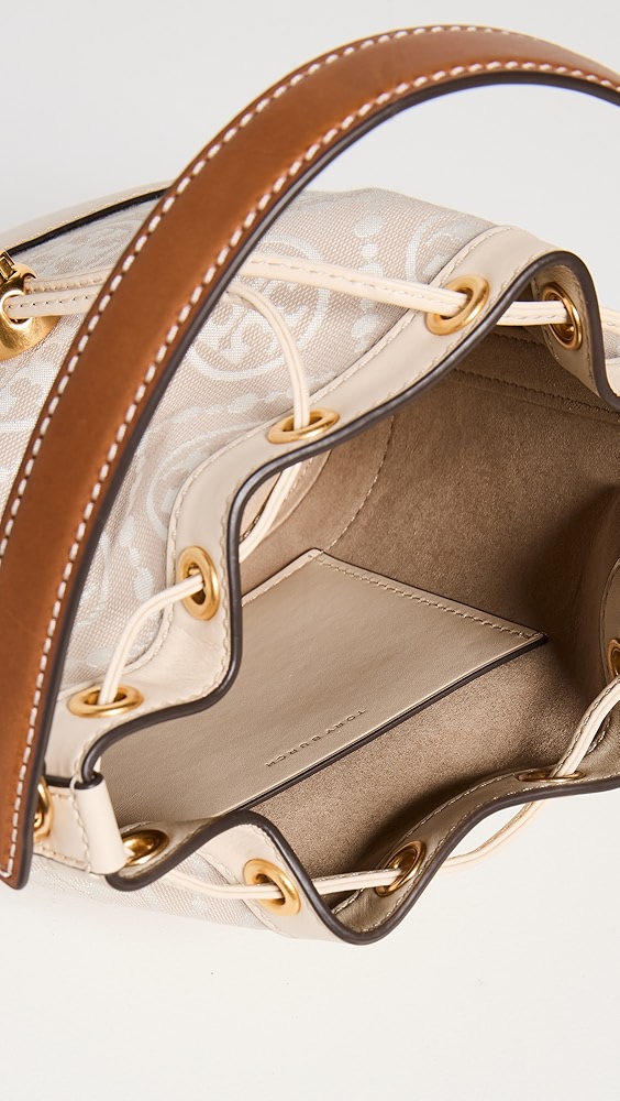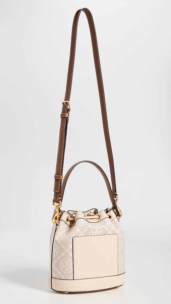 A scaled-down Tory Burch bucket bag, detailed with a rendition of the label's monogram for a polished and eye-catching look. Two shades of leather trim lend an eclectic finish to the silhouette.