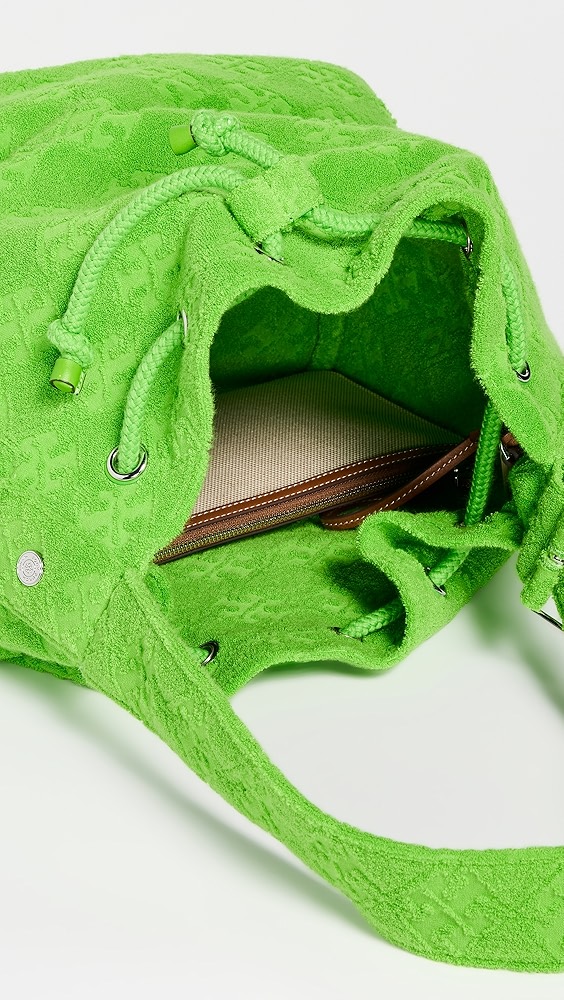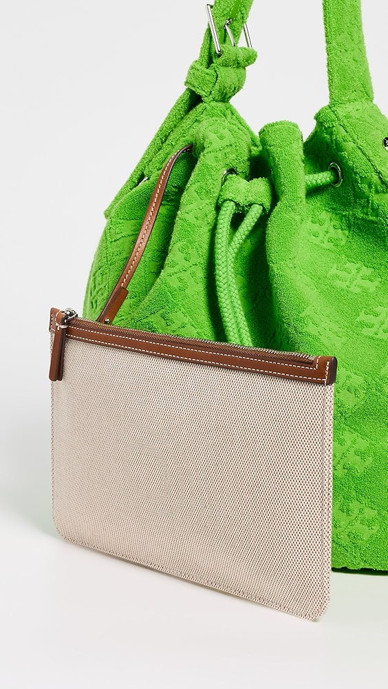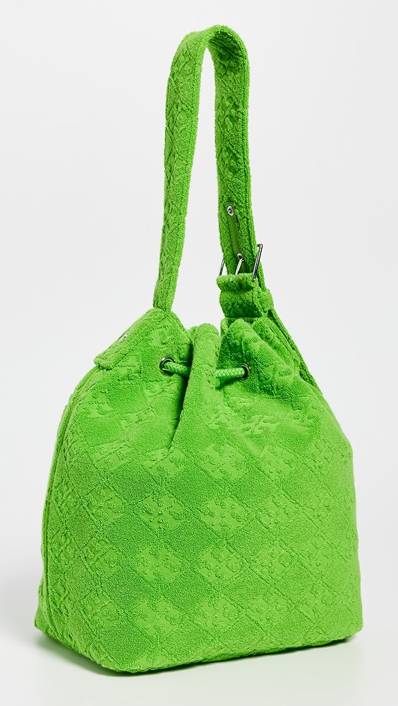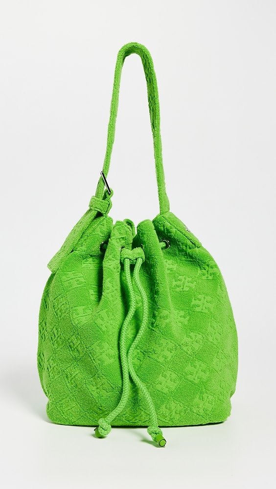 Fabric: Jacquard Monogram pattern Leather trim Gold-toned hardware Drawstring closure Optional, adjustable shoulder strap Textile lining Weight: 11oz / 0.31kg Imported, China Style #TORYB49310 A scaled-down Tory Burch bucket bag, detailed with a rendition of the label's monogram for a polished and eye-catching look. Two shades of leather trim lend…