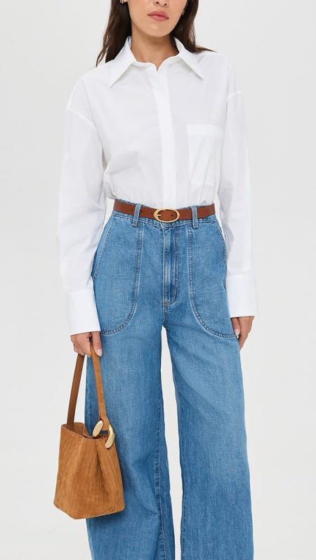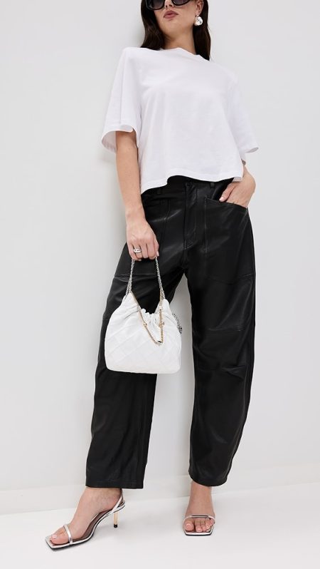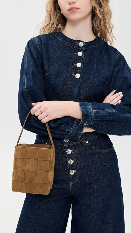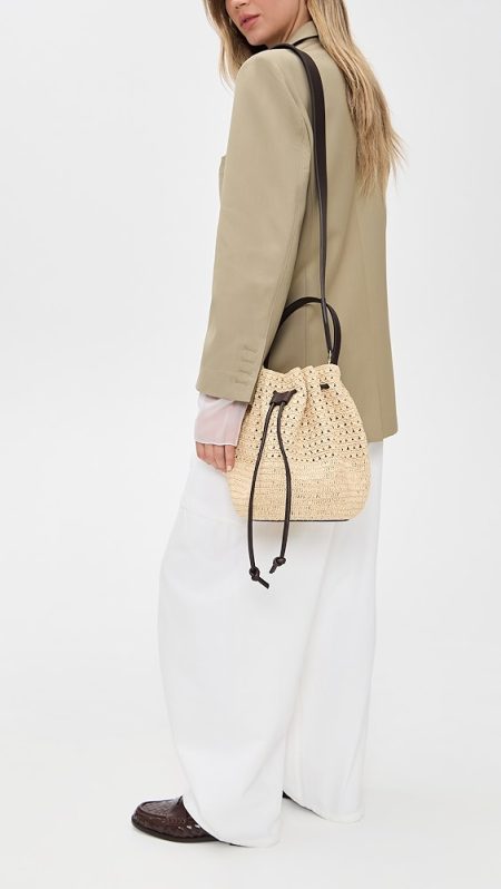 $267.00Fabric: Jacquard Structured silhouette Gold-tone hardware Monogram print Drawstring closure Patch interior pocket Optional, adjustable strap Suede lining Weight: 23oz / 0.65kg Imported, Vietnam Style #TORYB49238 A scaled-down Tory Burch bucket bag, detailed with a rendition of the label's monogram for a polished and eye-catching look. Two shades of leather…